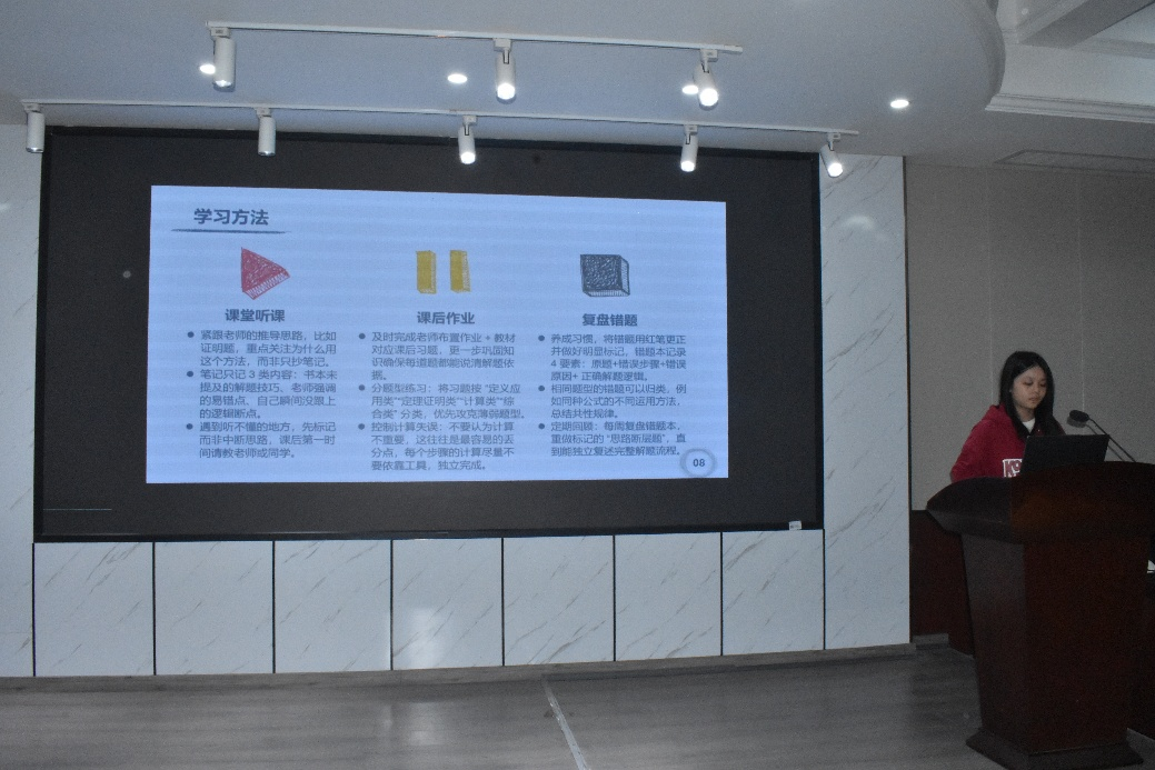分享环节中,戴翌婷同学精准列举高数学习中的常见通病,结构化梳理核心学习方法,还分享了个人笔记与学习心态调节经验,并推荐优质学习资料;宾芬同学详细拆解自身高数学习方法,给出“重视计算基础、避免孤立做题”的避坑建议,总结出“读中学、问中学、动中学、练中学”的学习经验;杨瑞同学以《高数经验分享:大一不踩坑》为主题,阐明高数学习的重要性,强调以三段式刷题节奏实现“精做”的核心原则,还分享了考前冲刺的复习方案。
