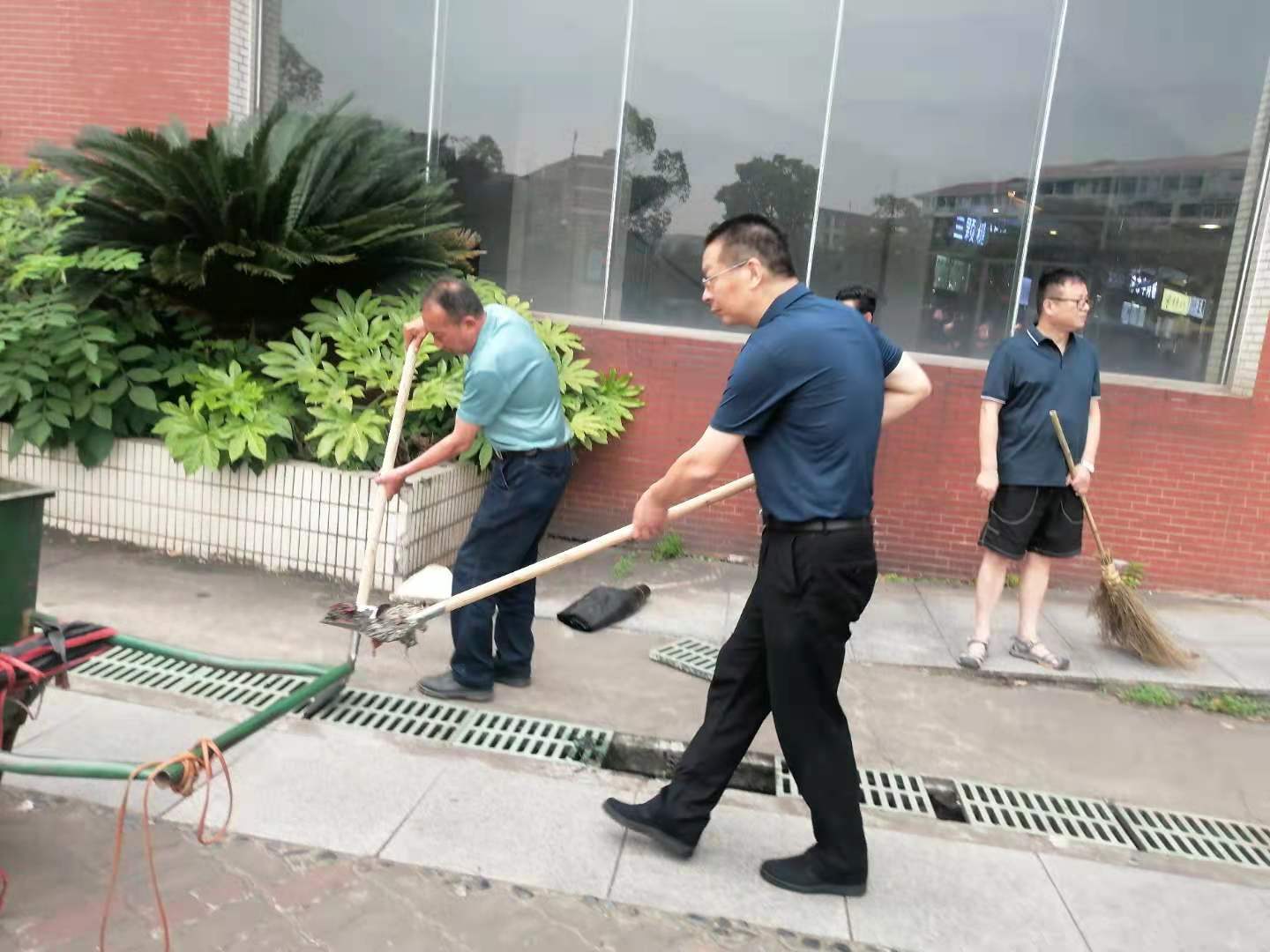 把屋檐沟井盖板揭开,一股恶臭扑鼻而来,经过的师生们掩鼻而过。同志们不皱一下眉,手持长长的消防水管,对准沟渠,进行冲洗;拿着铁铲,把已经沤坏了的枯叶杂物铲出;用扫地机高压水枪冲洗地面顽渍;用竹扫把清扫地面特别是地板砖缝隙中的淤泥……