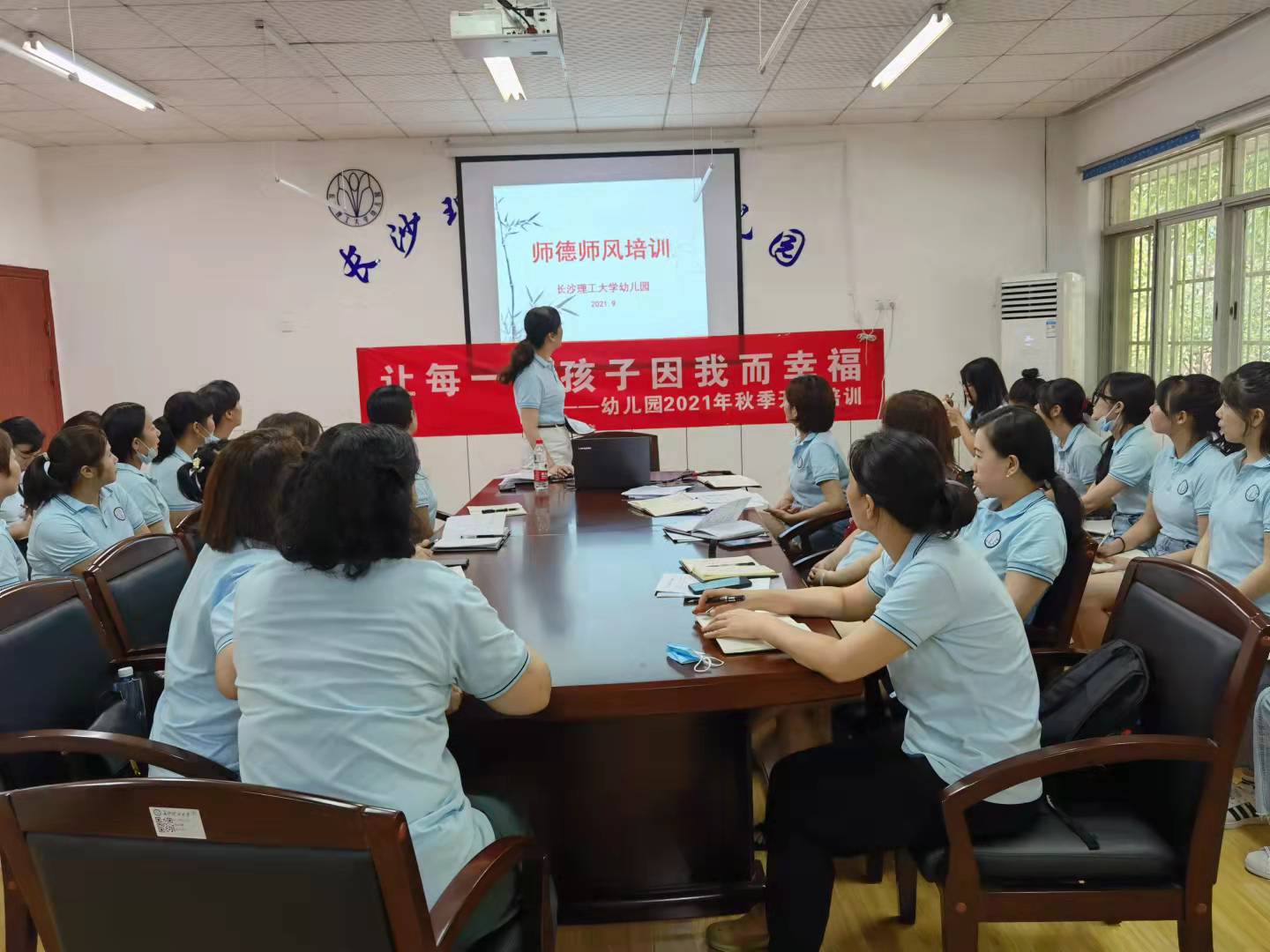 为确保新学期幼儿园工作正常有序开展,全体教职员工以积极向上的心态投入工作,小朋友们有个舒适温馨的学习生活环境,9月1日上午,我园组织全体教职工在三楼会议室召开了开园工作会议及培训活动。会议由园长傅敏主持。