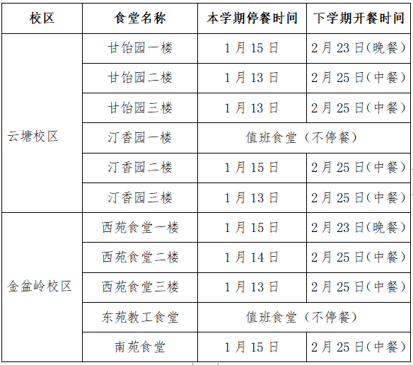因临近放假,学生陆续离校,就餐人数明显减少,后勤中心餐饮服务部各食堂停、开餐时间安排如下: