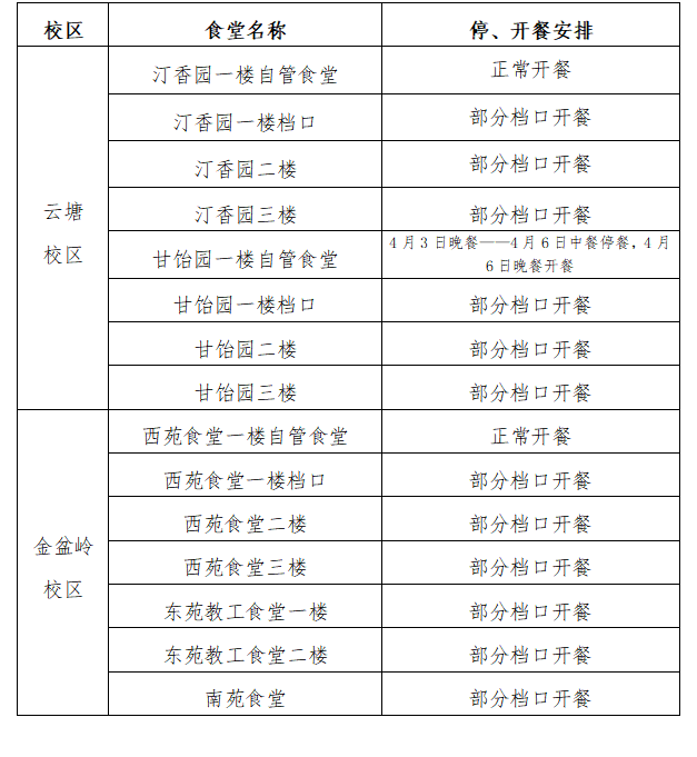 根据学校清明节放假安排,现将假期各食堂营业时间通知如下: