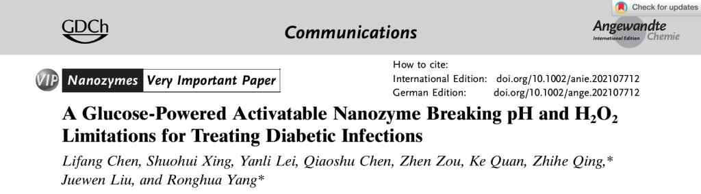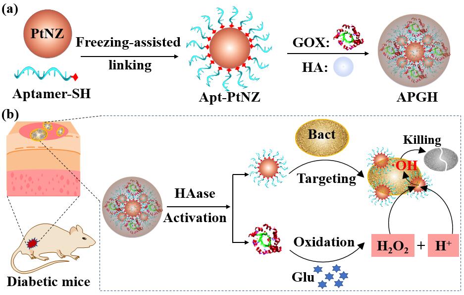 首先,基于DNA探针在铂纳米颗粒表面的高稳定性修饰和高保真信号释放的前期研究基础(Zhihe Qing, et al. Angew. Chem. Int. Ed. 2020, 59, 14044-14048; Zhihe Qing, et al. CCS Chem. 2020, 2, 1217–1230),卿志和博士课题组发展了一种细菌感染激活的纳米酶,在生理条件下同时打破局部pH和过氧化氢的限制,提高慢性伤口部位的抗菌效果。选取糖尿病伤口感染为研究模型,以DNA分子(细菌特异性核酸适体)功能化的铂纳米酶、葡萄糖氧化酶和透明质酸为组装单元,构建透明质酸酶(HAase)激活的纳米酶胶囊(APGH)。APGH在受感染的伤口中被细菌分泌的透明质酸酶激活,之后纳米酶通过表面修饰的核酸适体与细菌结合,葡萄糖氧化酶催化糖尿病伤口中高浓度的葡萄糖氧化,降低pH,补充过氧化氢,铂纳米酶在细菌表面原位生成·OH,提高了化动力学杀菌效果。APGH的活性转化与抗菌作用在体外实验和糖尿病伤口抗菌实验中得以验证。这种通过调控生理微环境以增强纳米酶活性的策略具有通用性,对促进纳米酶的生物学应用具有重要意义(Scheme 1)。该工作以“A Glucose-Powered Activatable Nanozyme Breaking pH and H2O2 Limitations for Treating Diabetic Infections”为题,于2021年8月10日发表在国际化学领域顶刊Angewandte Chemie,并入选VIP论文(Very Important Paper)和封面成果(Frontispiece),并被期刊官媒作新闻(News)报道。文章共同第一作者是XK星空硕士生陈丽芳、硕士生邢硕晖和雷艳丽博士,通讯作者是卿志和副教授和杨荣华教授。文章链接:https://onlinelibrary.wiley.com/doi/10.1002/anie.202107712。