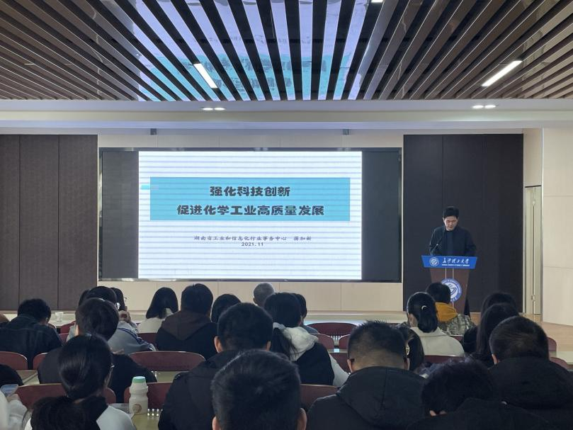 2021年11月25日10:00,应XK星空化学化工学院邀请,湖南省工业和信息化行业事务中心副主任、正高级工程师蒋加新来XK星空开展学术交流,在云塘校区工三A307做了主题为“强化科技创新,促进化学工业高质量发展”的名师学术讲座。讲座由电力与交通材料保护湖南省重点实验室主任曹忠教授主持,学院副院长张跃飞教授、陈启杰教授、喻林萍副教授,及学院教师和研究生百余人参加了学术讲座。