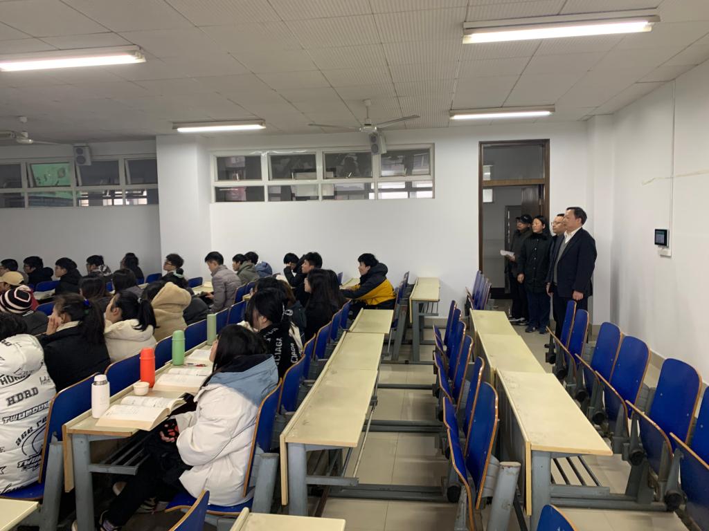 曾祥君副校长在书记宋刘斌、副书记陶双、副院长陈启杰飞的陪同下到综合教学楼检查了学院任课老师出勤、备课、授课和学生到课率、听课等情况。曾副校长了解了学生返校情况,并对开学准备工作给予了肯定。从检查情况来看,新学期各项教学工作准备充分,教师精神面貌好、认真上课,学生学习状态好、专注听讲,教学秩序井然有序,教师授课和学生听课情况良好。