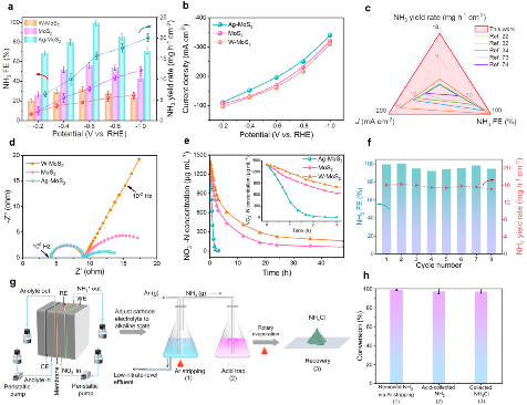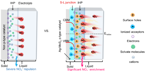 有鉴于此,我院廖婉茹博士、王君博士与中南大学刘敏教授、中国环境科学研究院席北斗研究员、德国慕尼黑大学Emiliano Cortés教授合作,开发了具有普适性的催化剂能带结构调控策略,利用Ag掺杂MoS2(Ag-MoS2)在NO3⁻还原体系中构筑固液结,诱导空穴从催化剂向电极/电解质界面转移,促进IHP区域内分布正电荷,实现工况条件下NO3⁻有效富集(NO3⁻浓度提高了约15.8倍)。利用这种富集效应,Ag-MoS2在超低NO3⁻浓度(≤10 mM)下实现了接近100%的NH3法拉第效率。此外,该催化剂以接近100%的效率将NO3⁻转化为高附加值的NH4Cl产品,展示了通过环境友好路线实现工业化规模生产的潜力。