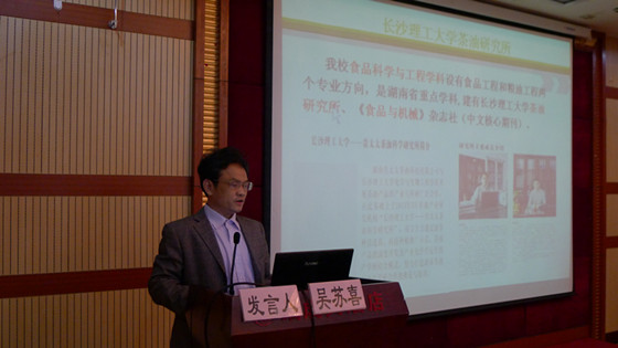 吴苏喜首先简单介绍了我院及食品科学与工程重点学科近年来快速发展取得的骄人成就,以及湖南省的油茶产业现状,然后重点阐述了化学学院茶油研究所在茶籽油加工方面取得的研究成果——改良水代法制取茶籽油新技术。他说,利用改良水代法制取茶籽油,能够在提高油脂得率的基础上最大程度地保留其营养成分,同时有利于副产品的综合利用。相关行业的与会代表对这一创新成果表示很感兴趣,希望与吴苏喜教授合作将这项技术转化应用到工业化生产当中。