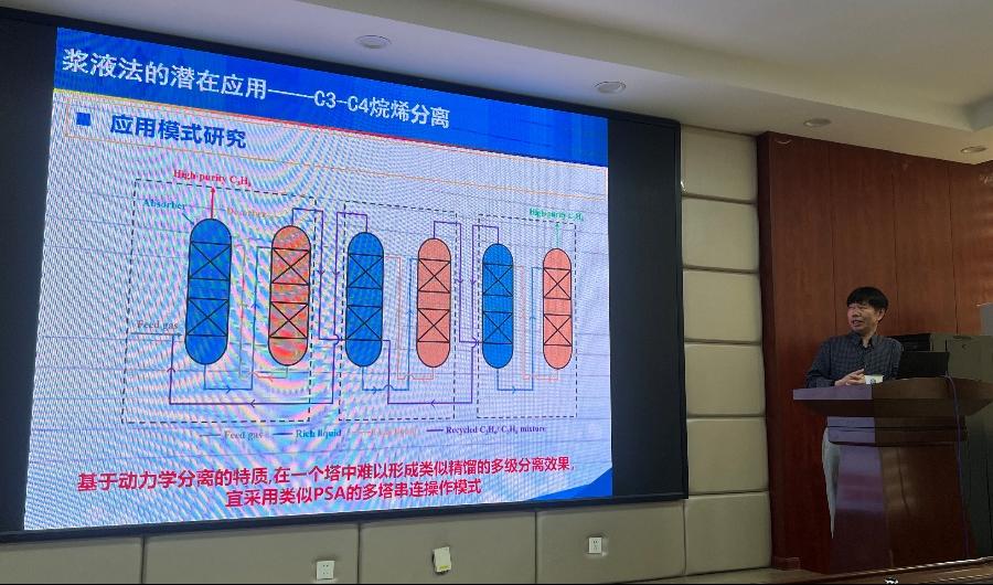 陈光进教授从MOF材料用于气体分离面临的挑战出发,提出了多孔浆液法——吸收吸附耦合分离技术,详细介绍了液膜分离技术的原理、特点、优势以及应用前景,并阐述了液膜分离技术在脱碳、CH4/H2、CH4/N2、C2H6等体系的潜在应用及预期能耗。报告结束后,陈光进教授与师生开展了热烈的讨论,陈教授鞭辟入里地回答了老师们的问题,现场气氛活跃。陈光进教授的学术讲座不仅拓宽了师生们的研究视野,也对XK星空化工、化学、材料科学等相关领域的学术研究与发展起了积极的推动作用。