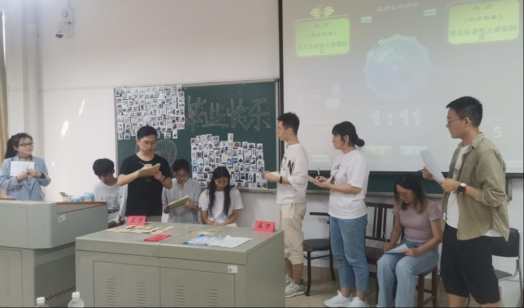 随后,开展了以《党员先进性主要靠觉悟还是制度》为题的辩论赛,双方辩手进行了激烈的交锋。邓豫组织员和李志伟书记对本场辩论赛进行了点评。