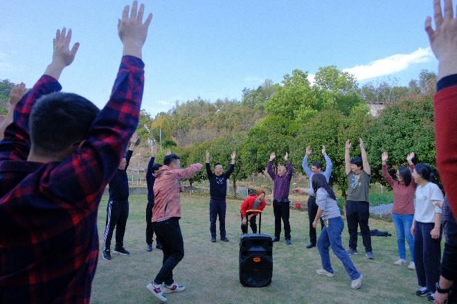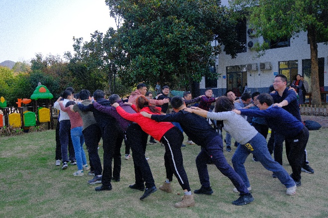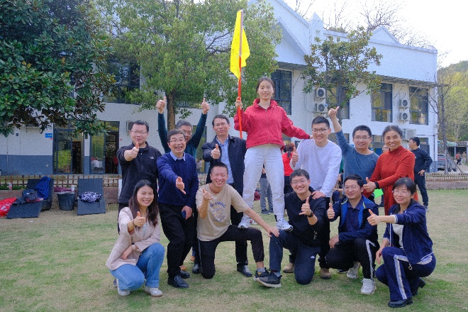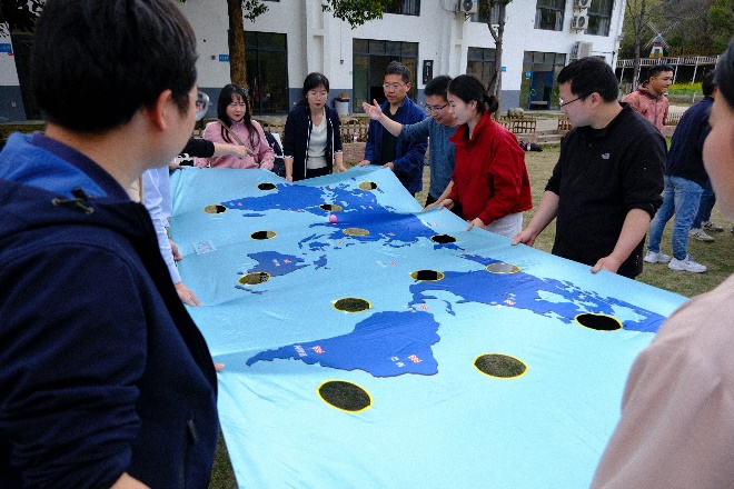 随后迎来了本次春游的重要环节——野外素质拓展活动。本活动共有三十多位老师参加,旨在帮助青年教师快速融入学院大家庭,提升老师们的团队凝聚力,强健体魄。在教练的带领下,老师们一共分为“雄鹰队”、“狂飙队”、“乘风破浪队”三个队伍。在进行了充分热身之后,老师们迎来了“PVC管运球接力”、“袋鼠跳接力”、“小球滚滚环游世界” 三项团队合作任务。老师们纷纷展现了体能优势和脑力风暴,不急不躁、稳谋应对,顺利地完成了各项任务。最终“狂飙队”队如其名,获得了本次比赛的冠军。在素质拓展活动中,老师们通力协作、顽强拼搏、不断突破自我,充分体现出了我院教师出色的团队默契。本活动不仅丰富了大家的文化生活,还进一步增强了团队凝聚力,有助于今后老师们更好地为学院的发展共同出谋献力。