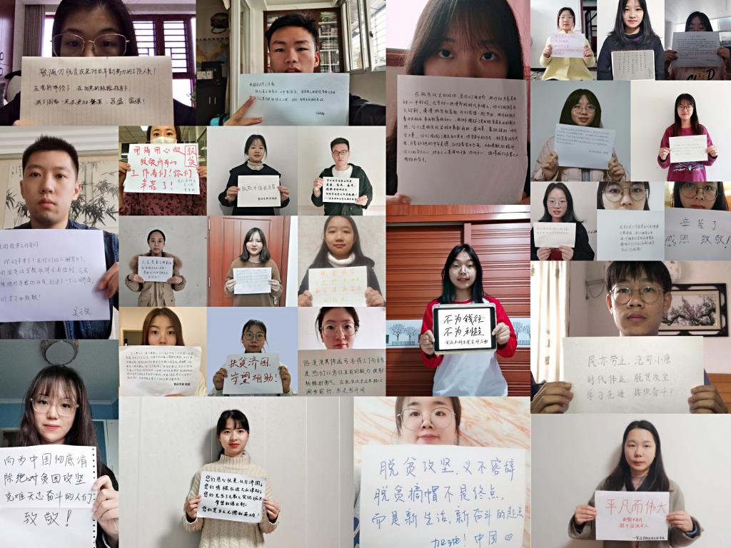 食品本科生党支部党员采取腾讯视频会议线上集体观看表彰大会的形式并展开了讨论,会后大家纷纷写上自己最想对脱贫攻坚工作者说的话,以独特的方式向他们致敬表白。
