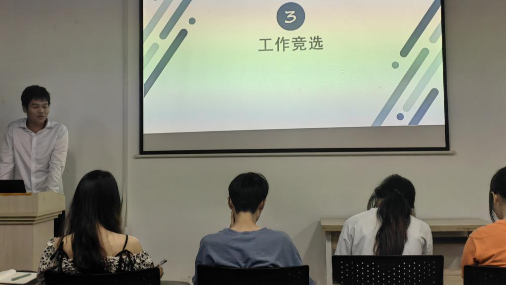 会议开始,由江洁老师发表讲话,对各个部门的工作表达了认可,并对各位部长和各位干事年度的工作表达了真切的赞赏和感谢。紧接着,各部门按照心理部、办公室、媒体部、宣传部和运营部的顺序依次上台作年度工作汇报总结。各部门汇报人就本年度所开展的各项工作进行汇报,并针对工作中所出现的不足作出反思;而后他们围绕在任职期间所学、所想、所悟、所得进行回顾与分享。其中,舍长和副社长针对不同的问题做出了指正与建议,大家都学到了许多。