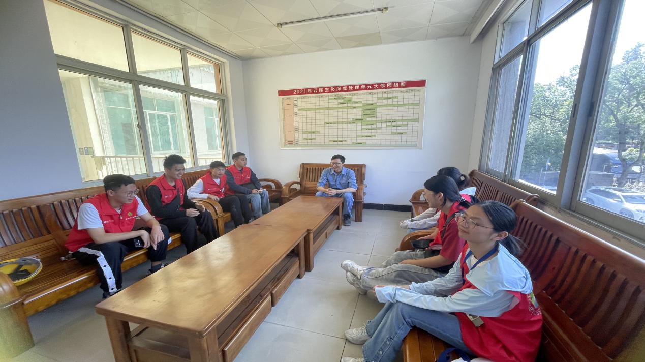 在访谈中,湖南石化水务部负责人胡超向实践团介绍了工厂污水处理的大致流程。湖南石化公司采取“污污分治”的方法,将不同性质的污水分开处理,达到减少处理工艺,节约污水处理成本的目的。