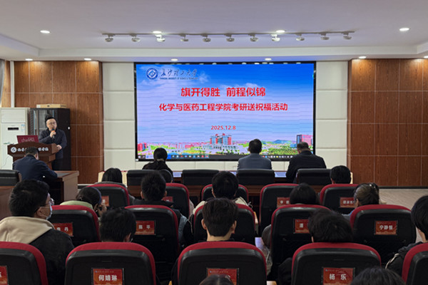 为鼓舞考研学子斗志,传递学院深切关怀,坚定学生必胜信念,2025年12月8日,化学与医药工程学院于云塘校区工科三号楼B319教室,举办了以“旗开得胜,前程似锦”为主题的2026届考研学子送祝福活动。学院领导班子成员、毕业班班主任、心理成长部朋辈干部及全体备战考研的学生参加了此次活动。