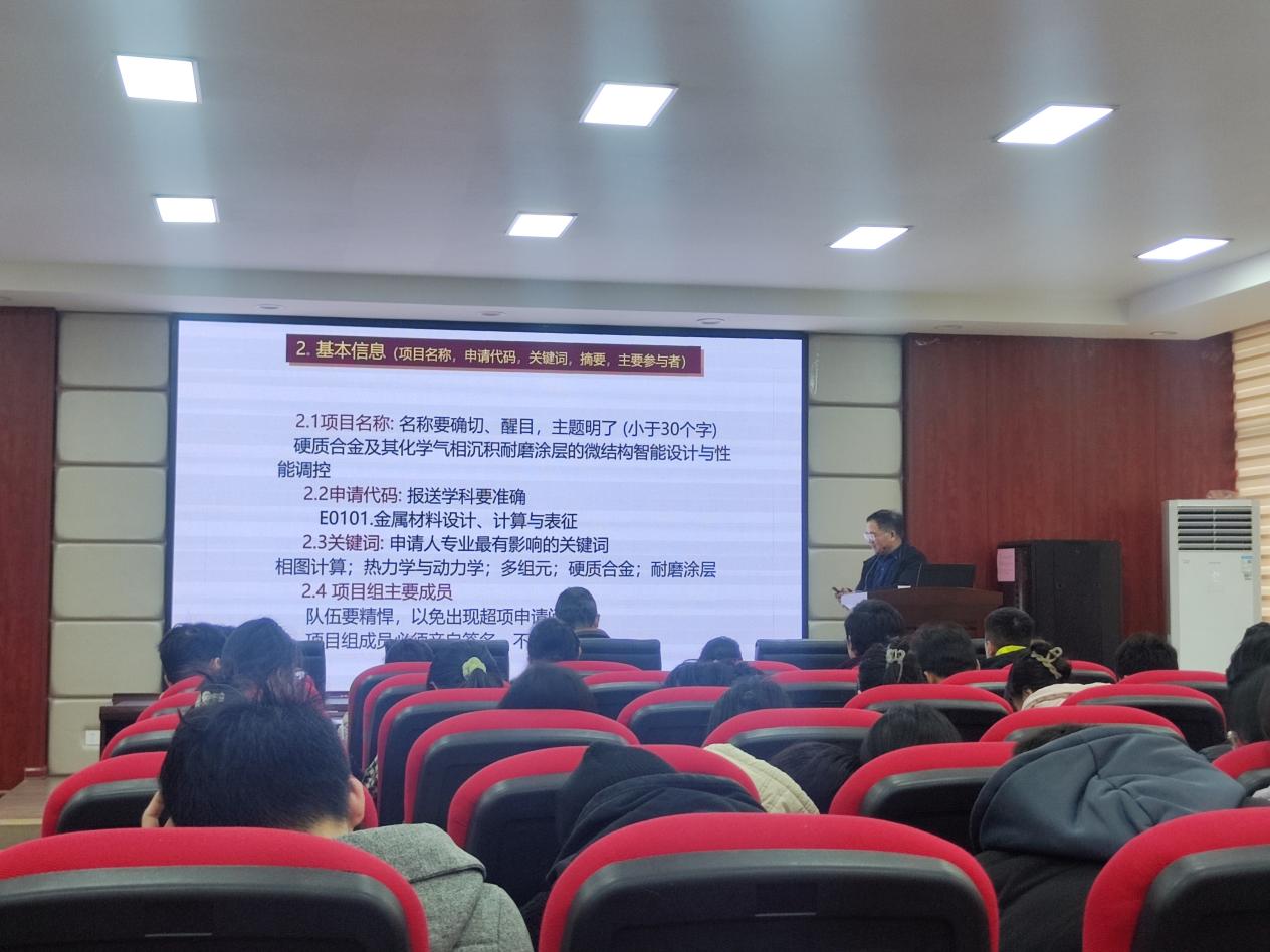 在学术交流的第二个环节,杜勇教授作了“国家自然科学基金项目申请探讨”的指导报告,从科学问题的属性、基本信息的填写、立项依据、研究内容、研究目标、研究基础与工作条件等方面作了细致讲解。杜教授分享了个人丰富的申报经验,对老师们提出的疑问进行了严谨幽默的回答;杜教授多次强调申报时的各个细节,例如注重文字的组织表达、语言是否通顺、是否通俗易懂等。在场的老师和同学们都在认真聆听,积极地与杜教授进行交流探讨,有老师也分享了自己的申报经历和成功的经验。本次讲座让大家都深受启发,激励今后在学术科研上更加努力学习和勇于钻研。