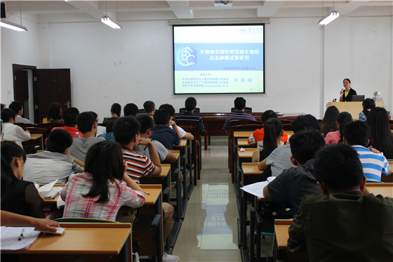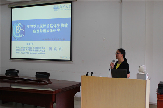 5月25日,应XK星空化学与生物工程学院邀请,湖南大学化学生物传感与计量学国家重点实验室副主任、生物学院副院长、博士生导师何晓晓教授来XK星空进行学术交流访问。上午10:00,何教授在云塘校区工科三号楼A-320会议室作了题为“生物纳米探针的活体生物效应及肿瘤成像研究”的学术报告,会议由化学学院副院长曹忠教授主持,曹教授首先代表学院向何晓晓教授的到来表示热烈的欢迎,接着介绍了何教授在生物功能化纳米材料及活体分子成像和药物控释载体领域所取得的重要成就。化学学院教师、研究生及本科生百余人聆听了报告。