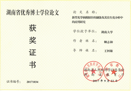 获奖题目:新型光学核酸探针的制备及其在生化分析中的应用研究