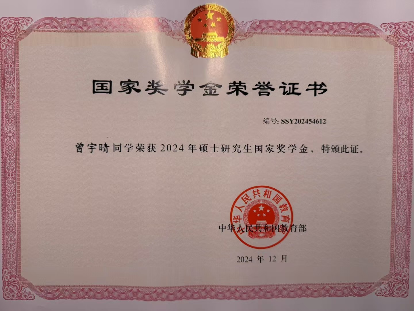 获奖等级:2024年硕士研究生国家奖学金