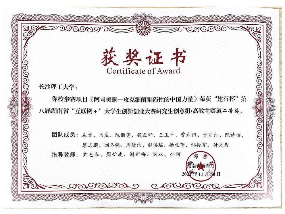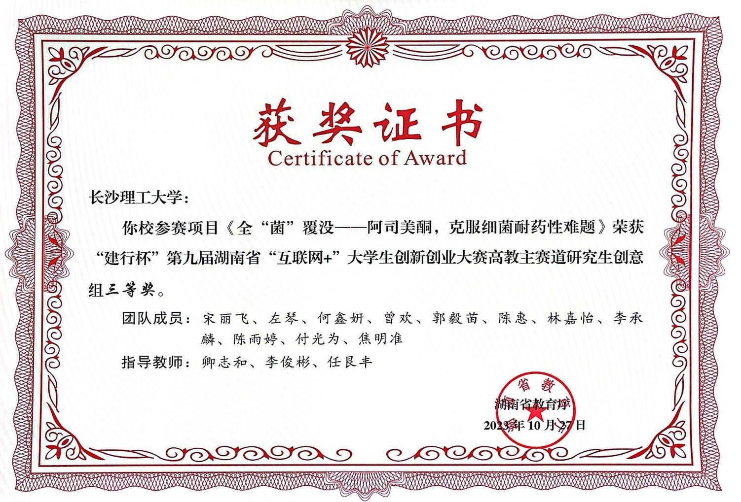 获奖等级:“建行杯”第九届湖南省“互联网+”大学生创新创业大赛高教主赛道研究生创意组 三等奖