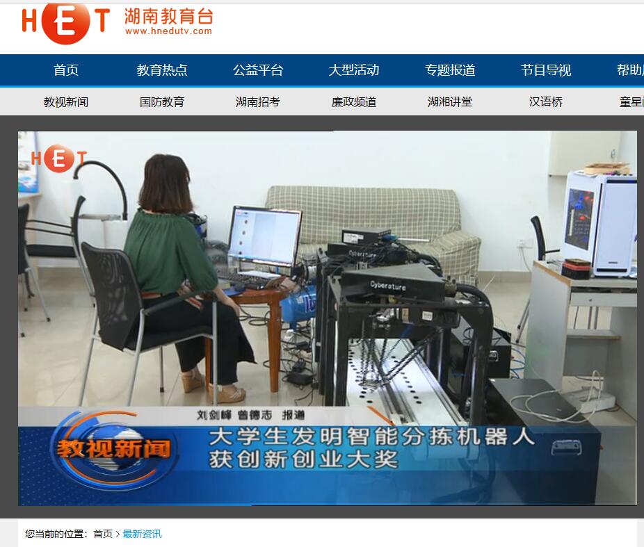 湖南教育电视台5月23日教视新闻对XK星空工程训练中心、创新创业教育学院王磊老师指导的“塞伯睿智能分拣机器人”项目进行了报道,该项目在5月18日,刚刚获得的了长沙市第十五届大学生科技创新创业大赛本科组一等奖(全市仅2项)。