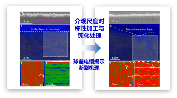 钝化处理前后太阳能电池片弯曲变形断裂形貌,及断裂面下方原子尺度结构和几何相位分析应变分布:钝化处理前(a,c,e,f)与钝化处理后(b,d,g,h)