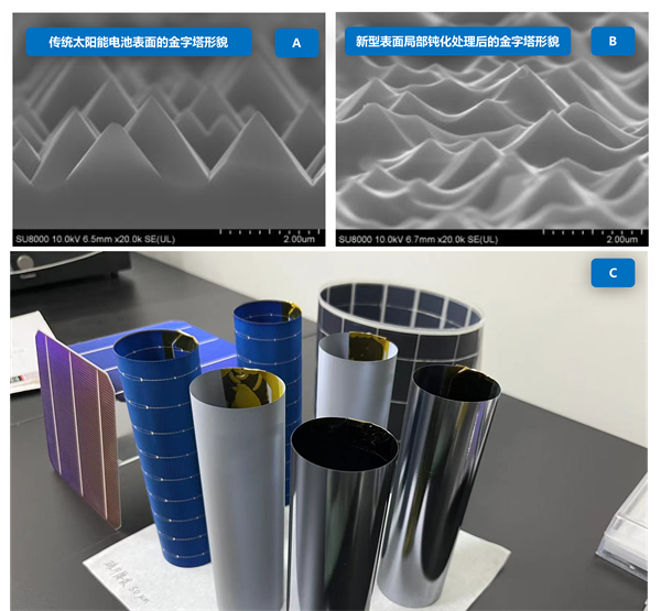 太阳能电池硅基片金字塔尖和塔谷进行钝化处理前后形貌对比:(A)处理前,(B)处理后,以及(C)可弯曲柔性硅基片及太阳能电池实物图