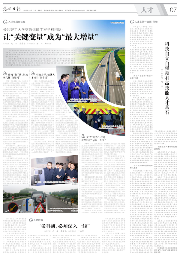 12月17日,《光明日报》人才版专版报道XK星空人才工作。在人才强国新征程板块刊发《XK星空交通运输工程学科团队:让“关键变量”成为“最大增量”》文章,在人才故事板块刊发《“做科研,必须深入一线”》文章。