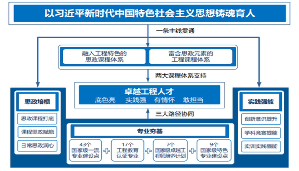 以国家战略需求为导向,以43个国家级一流本科专业建设点为基础,以17个工程教育认证专业、7个国家卓越工程师培养计划为依托,全面落实“新时代高教40条”,构建各类课程与思想政治理论课同向同行,形成协同效应的“思政课程引领、课程思政赋能、社会实践砺行”大思政格局,形成了“以习近平新时代中国特色社会主义思想铸魂育人”一条主线贯通,“融入工程特色的思政课程体系、富含思政元素的工程课程体系”两大课程体系支持,“思政培根、专业夯基、实践强能”三大路径协同的卓越工程人才培养新模式(图1)。
