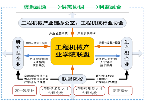 工程机械产业学院联盟既有实体型的产业学院、校企合作人才培养基地等,也有虚实结合的联盟协调机构;既有产业学院的内部协同,又有联盟成员之间的外部协同,还有校内协同,联盟发挥桥梁纽带作用,校企“1 对1”“1 对N”“N 对N”等多元合作模式增强了校企合作的广泛性、灵活性和适应性。