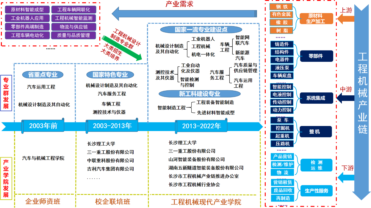 深化校政行企多元协同,提升专业建设水平。确立“面向工程机械产业,培养优质适配人才,服务地方经济发展”的工程机械现代产业学院发展定位,以“高校主导+政府导向+行业协会桥梁+企业参与”为建设范式,成立“校政行企”共同参与的专业建设指导委员会,在多维协作中实现高校新工科人才培养与企业创新发展的合作共赢,机械设计制造及自动化、车辆工程、测控技术与仪器、汽车服务工程等4个专业获批国家一流专业建设点。