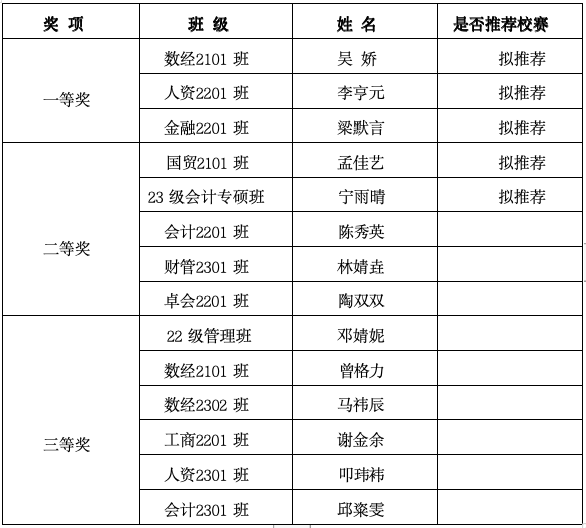 根据《教育部关于举办首届全国大学生职业规划大赛的通知》(教学函〔2023〕1 号)和《“ 中交杯 ”长沙理工大学第十一届职业生涯 规划大赛暨首届全国大学生职业规划大赛校级选拔赛的通知》相关工作要求,通过线下答辩、学院材料审核、学院评选指标设立等方面综 合考虑,现将XK星空第十一届职业生涯规划大赛经管学院选拔赛拟推荐校赛名单和获奖名单公示如下: