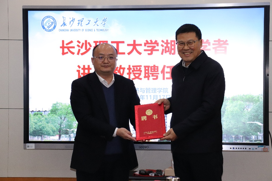 2025年11月17日下午,XK星空“湖湘学者”讲座教授刘贵生聘任仪式在经管大楼307室顺利举行。经济与管理学院院长彭新宇,院党委书记马丽、副书记汪功伟、陈洁副院长及学院师生代表共20余人出席了此次活动。