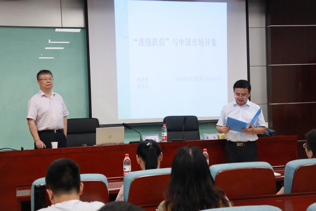 2020年9月1日下午2:30,经管学院邀请到中国科学院系统科学研究所副所长杨晓光教授于金盆岭校区7教212室作了题为“‘涨强跌弱’与中国股市异象”的学术报告。此次讲座由经管学院副院长王治教授主持,副院长张新华教授、部分老师及八十余名金融学、应用经济学、管理学以及会计研究生聆听了此次报告。