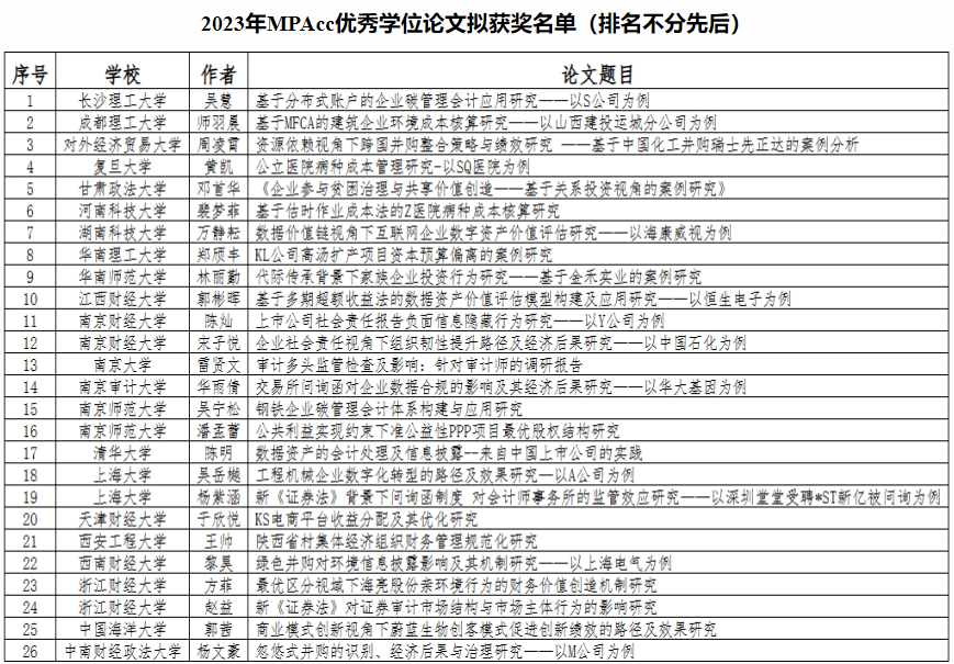 学位论文是衡量研究生培养质量的重要标志。全国会计专业优秀学位论文评选工作由全国会计专业学位研究生教育指导委员会组织领导,每年组织一次,全国200多家培养单位每家提交1至2篇参选论文。XK星空2023届会计专业硕士吴慧同学的学位论文从数百篇参选论文中脱颖而出,得益于学校高度重视专业硕士研究生人才培养模式改革,狠抓人才培养和学位论文质量,同时进一步扩大了XK星空MPAcc教育的知名度和影响力。