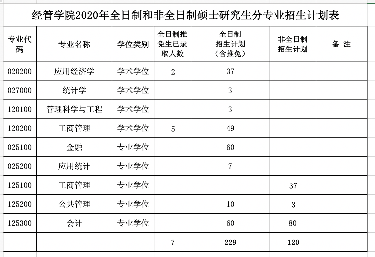 经管学院2020年全日制和非全日制硕士研究生分专业招生计划表