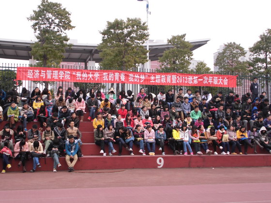 2013年12月10日下午1:00,经管学院“我的大学我的青春 我的梦”主题教育活动暨2013级年级大会在云塘校区田径场顺利召开。13级学生辅导员计潇老师主持了此次大会,我院学生辅导员肖翠老师、李丽兰老师以及2013级全体学生参加了本次大会。