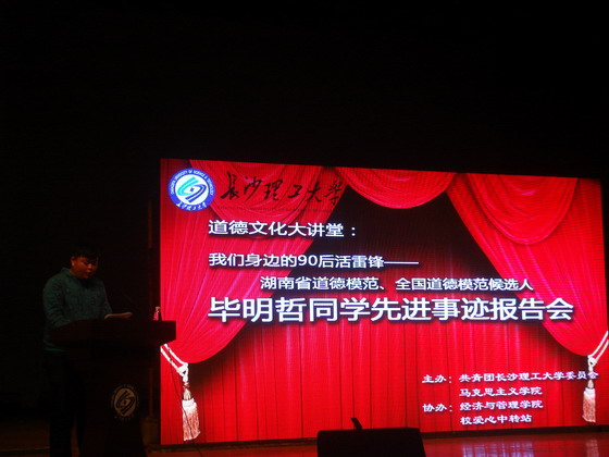 3月18日下午3:30,由共青团XK星空委员会、马克思主义学院主办,经济与管理学院、校爱心中转站协办的道德文化大讲堂之七:“我们身边的90后活雷锋——毕明哲同学先进事迹报告会”在云塘校区大会堂隆重举行。XK星空副校长邹宏如教授、宣传部部长王宏、学工部部长邹兴平、教务处处长李录平、自评办主任张宏伟等嘉宾出席了报告会。各学院13级学生作为观众参加了报告会。