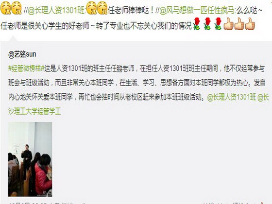 我院学生积极参与,他们有的记录下热心的、发自内心关怀关爱学生的班主任老师的工作点滴,有的传播身边同学的正能量如课前帮助老师擦黑板等,还有的同学着眼身边事,呼吁大家节约用水、把垃圾装进袋子方便打扫等。通过评论与转发,将微榜样的力量进一步扩大。