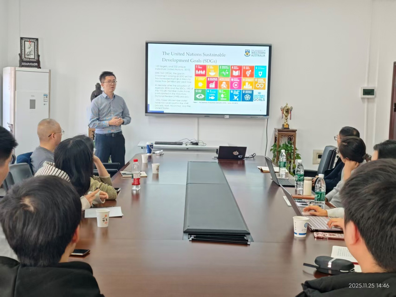 2025年11月25日下午,西澳大学(UWA)商学院钟一帆研究员应邀在经管大楼207室主讲金岭学术大讲堂第80期(2025年第34期),讲座主题为“企业社会责任如何连接可持续发展目标?”。讲座由企业管理系主任唐文彬教授主持,20余名师生参加了此次学术交流。