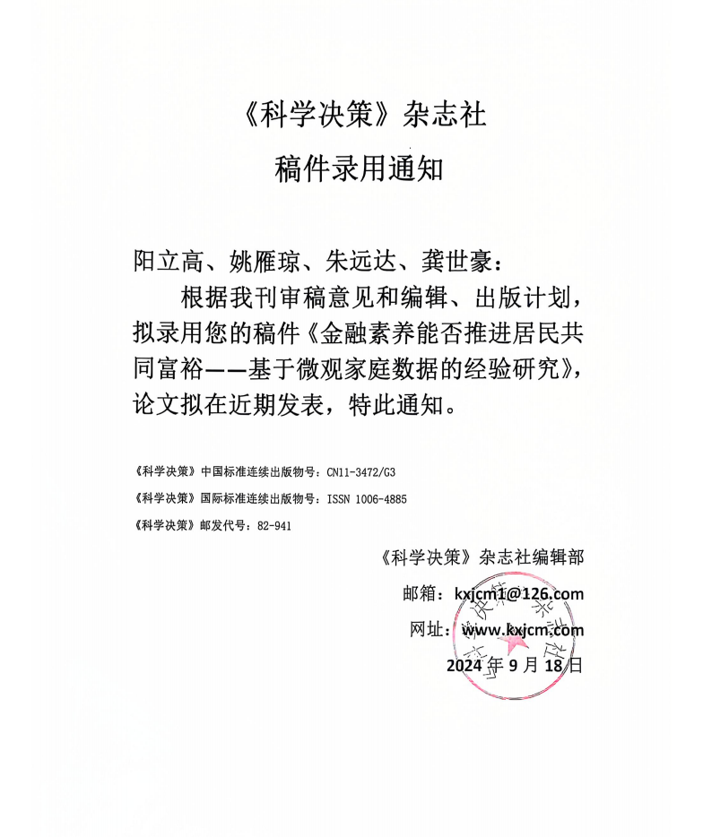 由我院阳立高教授、龚世豪老师、冯萍老师指导,我院本科生姚雁琼为第二作者完成的学术论文《金融素养能否推进居民共同富裕——基于微观家庭数据的经验研究》成功被中文CSSCI核心期刊《科学决策》录用。