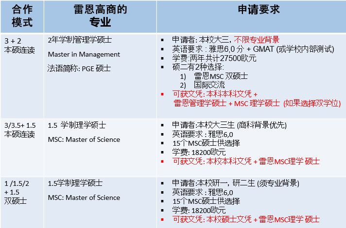 XK星空两年制或三年制在读硕士在XK星空完成1年或1.5年或2年的硕士学习后,赴雷恩商学院进行1.5年的理学硕士(MSC: Master of Science)课程学习。同时满足XK星空和雷恩商学院学分和论文要求,达到两校毕业和授位条件,可获得本校硕士学位和雷恩商学院理学硕士学位。