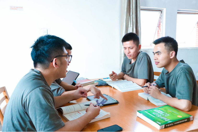 虽然录取的专业不同但他们都有一个梦想——参军入伍2017年9月,当看到学校的征兵宣传后他们都毅然报名并如愿成为了光荣的中国人民解放军战士。在部队,蒋利杨被选入报务员集训队,一部电台、一副耳机和无限循环的莫尔斯电码,他日复一日地训练。因表现突出,他先后被评为“理论标兵”“优秀义务兵”,2019年8月记嘉奖一次,还光荣入党。张梁原本身材瘦弱,但每天50公里的负重训练,他从不认输。千锤百炼下,他在全军竞赛比武中一路过关斩将,荣获个人三等功。他们在各自岗位上争创一流,大大小小30余个奖项,见证着他们的坚定信念和无悔付出。退伍后,他们重返校园,继续学业梦想,同时对自己的能力提出了更高的要求。4人的综合测评成绩稳居全年级前列,还参加各类学科竞赛10多项。临近毕业,他们4人都有良好的就业前景,但不约而同选择考研,想在更高的平台上为国家作贡献。为相互鼓励,他们建立了“今天你学习了吗”互助群,统一作息时间,互相监督复习。“不相信有完不成的任务,不相信有克服不了的困难,不相信有战胜不了的敌人”,他们常用杨根思的精神相互鼓舞。