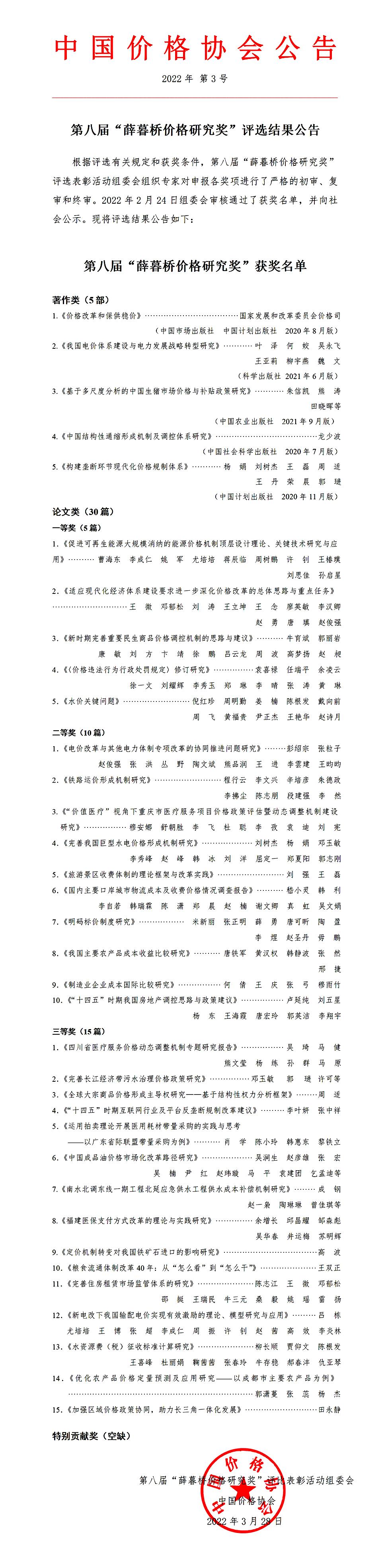 3月28日,中国价格协会官网公告,第八届“薛暮桥价格研究奖”评选表彰活动组委会审核通过了获奖名单,XK星空经济与管理学院叶泽教授团队(叶泽、何姣、吴永飞、王亚莉、柳宇燕、魏文)著作《我国电价体系建设与电力发展战略转型研究》荣获第八届薛暮桥价格研究奖,实现了我院在该奖项领域零的突破。