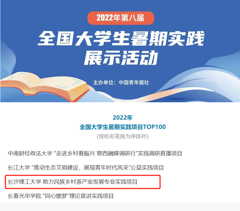 近日,2022年第八届全国大学生暑期实践展示活动名单公布,XK星空经管学院“助力民族乡村茶产业发展专业实践项目”荣获2022年第八届全国大学生暑期实践TOP100。该项目是由经管学院敖洁教授指导,由21级公共管理班王梦晗、张晗、刘雅杰、王秀梅、刘敏、21级经济班石璐青等6名研究生组成的暑期社会实践团队完成。