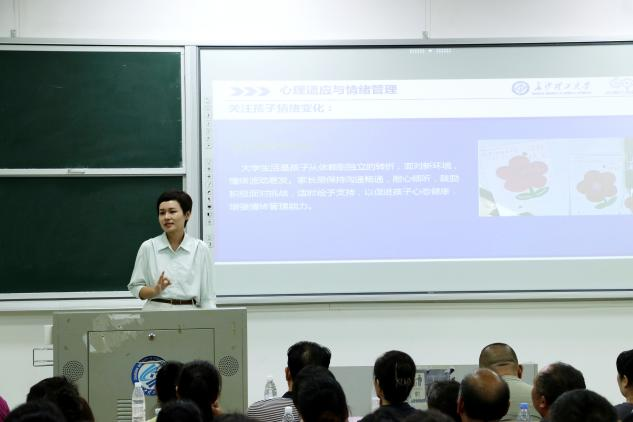 随后,王觊婧从心理适应、学业规划、生活管理、安全教育四方面给出建议,提醒家长关注孩子情绪波动与健康生活习惯,引导新生平衡学业与课外活动,同时强调防范诈骗、下载“国家反诈中心APP”等安全要点,并公布了辅导员、学工办的联系方式,畅通家校沟通渠道。