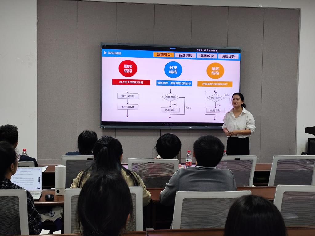 为促进教学经验交流,提升年青教师授课水平与课堂教学质量,10月14日下午4点,计算机学院在9教211室举办教学示范课活动。此次示范课由2024年湖南省数字化教学竞赛一等奖获得者黄明凤老师主讲,学院领导、督导专家及教学管理人员出席活动,近三年新进教师参与观摩并开展深入研讨。