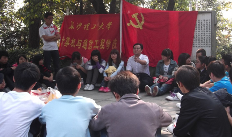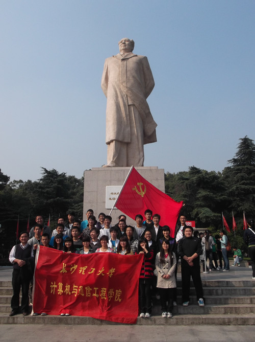 早上8点半,学员们从云塘出发,10点到达东方红广场,全体学员在毛主席的雕像下合影留念。10点半左右,在伍接朝老师的带领下,活动负责人谭飞刚、佘灿、何克岩、席斌同学组织全体学员代表开始登山。一路上,XK星空计通学院的院旗和中国共产党的党旗在登往岳麓山的路上随风飘扬,形成了一道亮丽的风景线。尽管山路崎岖漫长,同学们却兴致勃勃,一路上有说有笑,非常热闹。经过将近40分钟的跋涉,全体学员代表到达黄兴墓前。在整理好队伍后,入党积极分子培训班班长席斌向同学们简单的介绍了黄兴的生平事迹,党校助理班主任谭飞刚同学带领全体学员代表高举拳头,在黄兴墓前,面对中国共产党党旗庄严宣誓。下午1点左右,伍老师组织学员们进行座谈,同学们在黄兴墓边席地而坐,围成一个圈,把零食当做午餐,一边吃着零食一边开始进行交流,来自学院本科生四个年级和研究生两个年级,计算机、通信、网络和软件四个专业的入党积极分子以及预备党员们在此刻就像亲密的一家人。伍老师向大家说明了此次来岳麓山的意义,简要的介绍了辛亥革命的和中国共产党历史,并带领大家学唱《国际歌》。在伍老师的带动下,同学们纷纷上场表演节目,交流活动一直进行到下午3点。
