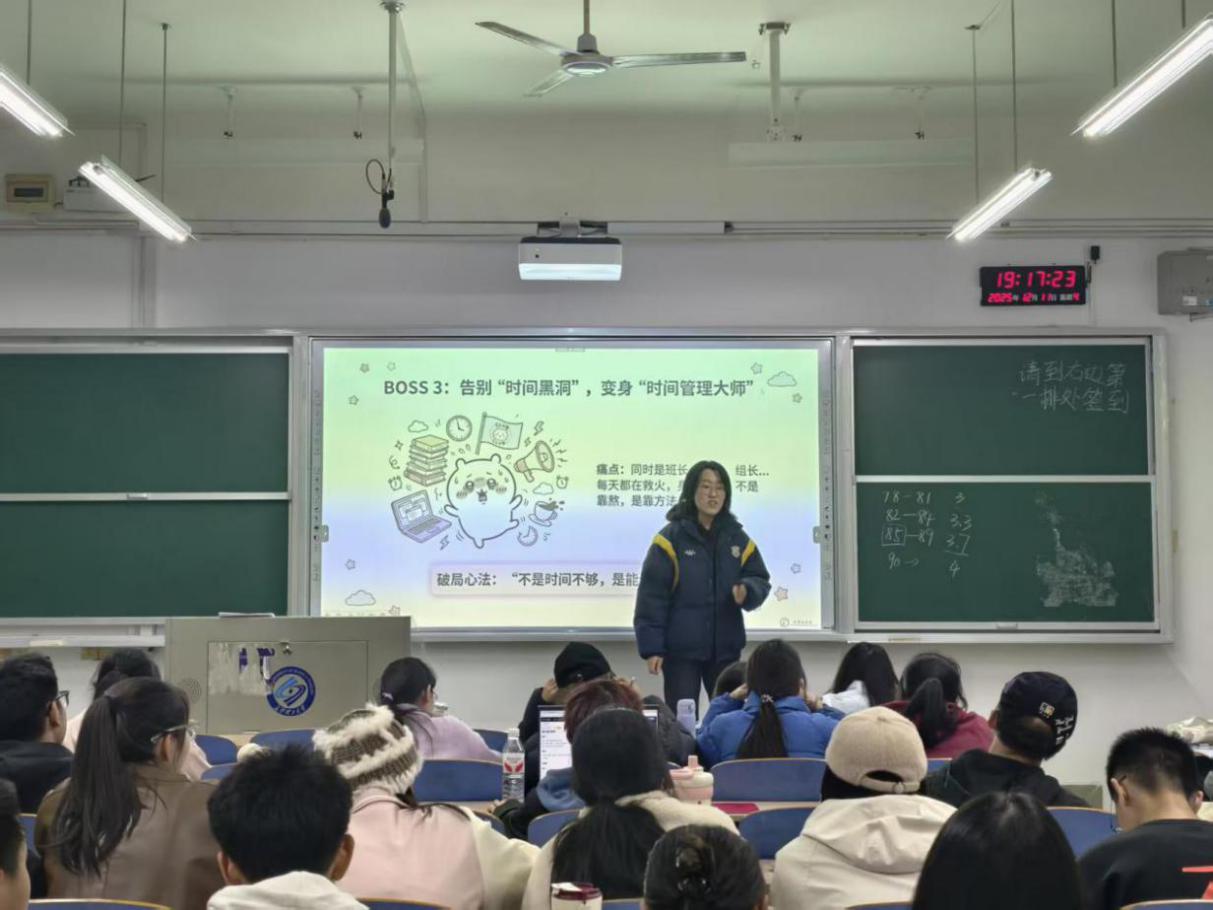 作为学业优异、能力突出的朋辈榜样,刘家熠结合自身担任院团委学生会轮值主席、计科2301班班长的实践经历,以实用技能赋能成长为核心展开授课。她从工作沟通技巧切入,分享沟通模板并结合真实案例演示事务协调方法;随后以智创杯等活动为实例,拆解活动策划与执行的全流程要点,细致传授时间把控、跨部门协作的实用技巧。同时,她还分享了平衡学业与工作的宝贵心得,鼓励同学们在服务集体的过程中锤炼综合素养。