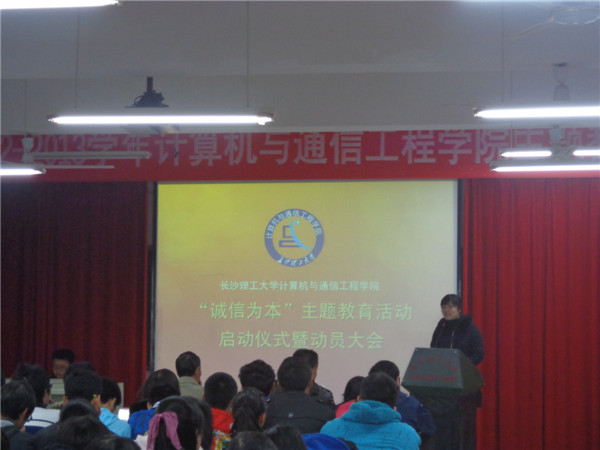 11月15日晚,”诚信为本”主题教育启动仪式暨动员大会在理科楼B311顺利召开。出席的领导有院党委副书记方碧波,关工委副主任雷理成,学工办主任任志祥,分团委书记肖苹宁及学院学生代表。