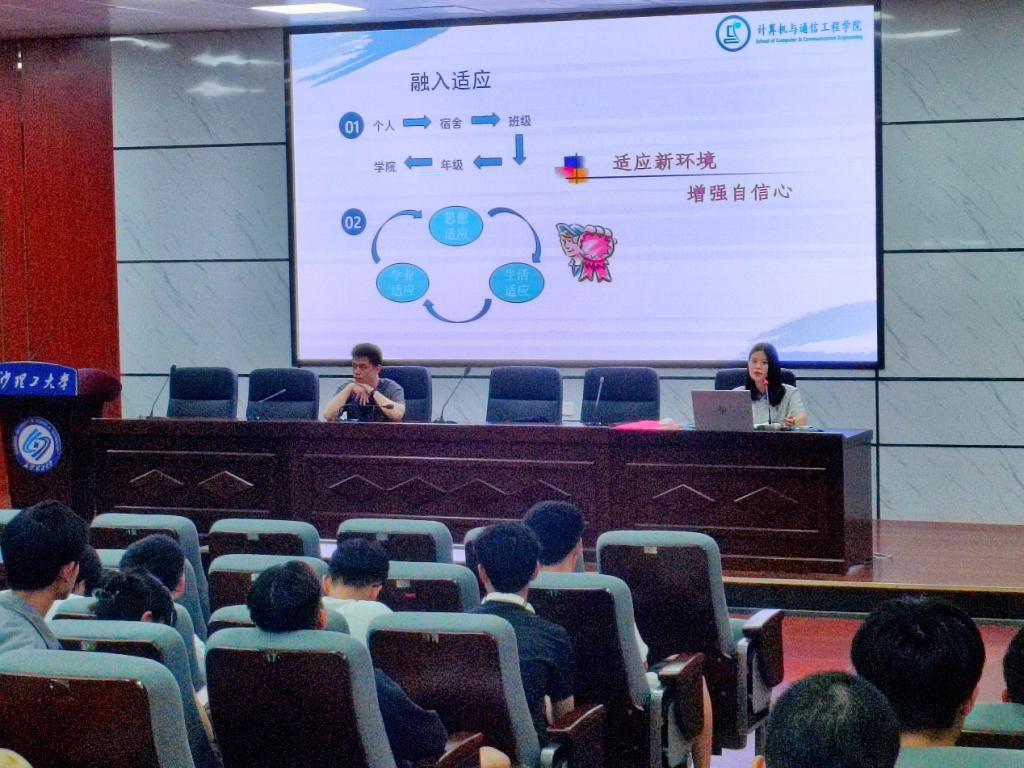 6月24日下午,计算机与通信工程学院2023级转专业学生大会在金盆岭校区4教报告厅顺利举行。2023级辅导员刘洋、刘俊出席此次会议,2023级转入计通学院的全体学生参加此次会议。此次活动旨在为新转入的学生提供一个互相认识、沟通交流的平台,帮助他们更好地融入新的学习环境。