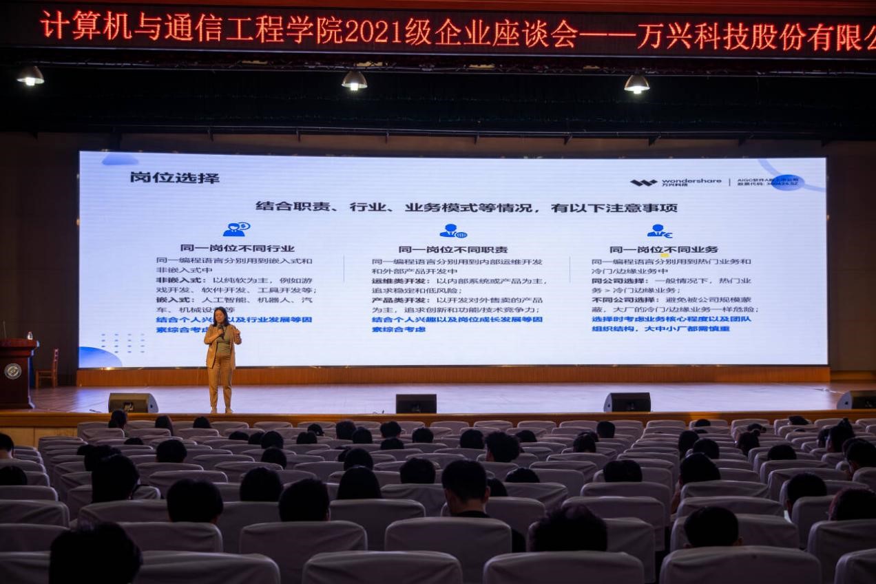 讲座开始,刘莉莉首先从科技发展的角度剖析当前IT行业的发展态势,帮助同学们重新认识IT行业未来特点,确定个人总体培养方向。其次,她从专业的角度为同学们给出了发展建议,使同学们从多个层次对自己的未来发展有了更加清晰的认识。此外,她列举了几个真实的成长案例,为同学们提供了具体的参照,同学们也积极进行互动提问。最后,她对万兴科技进行了详尽的介绍,并表示欢迎同学们未来加入万兴科技。